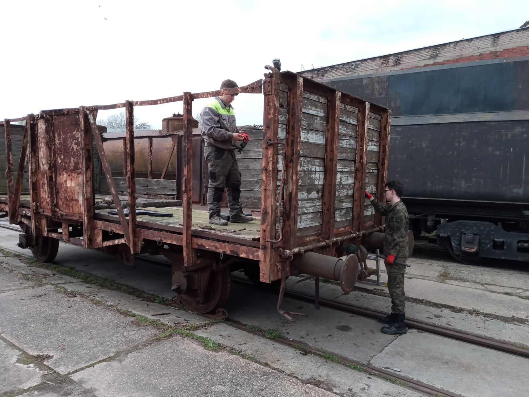 W 2025 roku, Fundacja Grupy PKP pomogła nam kontynuować odbudowę dwuosiowego wagonu towarowego – polskiej węglarki z 1927 r. (typ CIIa, seria Wddz); Łączna wartość zrealizowanych w ubiegłym roku prac wyniosła ponad 18 tys. zł, z czego ponad 1/3 stanowił wkład własny PSMK. Dzięki tym środkom, realizowaliśmy zadanie pn.: „„Pociąg stuletni PSMK” – III etap prac przy odbudowie polskiej węglarki z 1927 r. uzupełniającej skład pociągu„. W ramach zadania zakupiliśmy drewno niezbędne do wykonania pokrycia podłogi i burt wagonu i zleciliśmy jego obróbkę. Zakupione deski zostały docięte i ostrugane na wymiary zgodne z dokumentacją fabryczną, a następnie po odbiorze ze stolarni, już w naszej Parowozowni, zostały zabezpieczone przed chłonięciem wilgoci przez wstępne malowanie. Pozyskane wsparcie finansowe pozwoliło nam również kontynuować prace ślusarskie przy wagonie – po ich przeprowadzeniu konstrukcje dwóch ścian wagonu (bocznej i czołowej) zostały zabezpieczone antykorozyjnie. W dalszym ciągu konieczne jest dokończenie prac ślusarskich przy drugiej połówce węglarki.